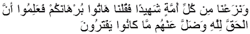 WanazaAAna min kulli ommatin shaheedan faqulna hatoo burhanakum faAAalimoo anna alhaqqa lillahi wadalla AAanhum ma kanoo yaftaroon