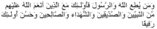 Waman yutiAAi Allaha warrasoola faolaika maAAa allatheena anAAama Allahu AAalayhim mina annabiyyeena wassiddeeqeena washshuhadai wassaliheena wahasuna olaika rafeeqa
